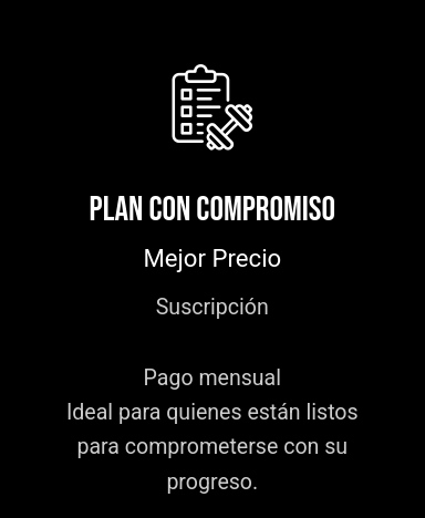 InicioMembresíasPlan con Compromiso (Mejor Precio) Plan con Compromiso (Mejor Precio)Desde $75.00 cada mes para 12 meses Pago tipo suscripción $75/mes durante 3, 6, 9 o 12 meses Set-UP: $25 BONUS: Al terminar tu periodo, puedes renovar UNA VEZ más sin pagar el Set-UP (siempre que haya continuidad) Ahorras $10/mes vs mes a mes Ideal para quienes están listos para comprometerse con su progreso. Duración Elige una opción3 meses6 meses9 meses12 mesesBorrar Plan con Compromiso (Mejor Precio) cantidad Registrarme Add to WishlistRemove from Wishlist Add to Wishlist SKU: N/D Categoría: Membresías Product ID: 35730 Información adicional Valoraciones (0) Información adicional Duración 3 meses, 6 meses, 9 meses, 12 meses Valoraciones No hay valoraciones aún. Sé el primero en valorar “Plan con Compromiso (Mejor Precio)” Cancelar la respuestaTu dirección de correo electrónico no será publicada. Los campos obligatorios están marcados con *Nombre * Correo electrónico * Guarda mi nombre, correo electrónico y web en este navegador para la próxima vez que comente. Tu puntuación * Puntuar… Perfecto Bueno Normal No está tan mal Muy pobre Tu valoración * I agree that my submitted data is being collected and stored. * Productos relacionados Add to WishlistRemove from Wishlist Add to Wishlist Paquete de Clases (Para Horarios Irregulares) $10.00 Comprar ahora Add to WishlistRemove from Wishlist Add to Wishlist Mes a Mes (Flexibilidad Total) $85.00 Comprar ahora Hasta - 19% Add to WishlistRemove from Wishlist Add to Wishlist Pago Anticipado (Máximo Ahorro) $225.00 - $744.63Rango de precios: desde $225.00 hasta $744.63 Comprar ahora Este producto tiene múltiples variantes. Las opciones se pueden elegir en la página de producto